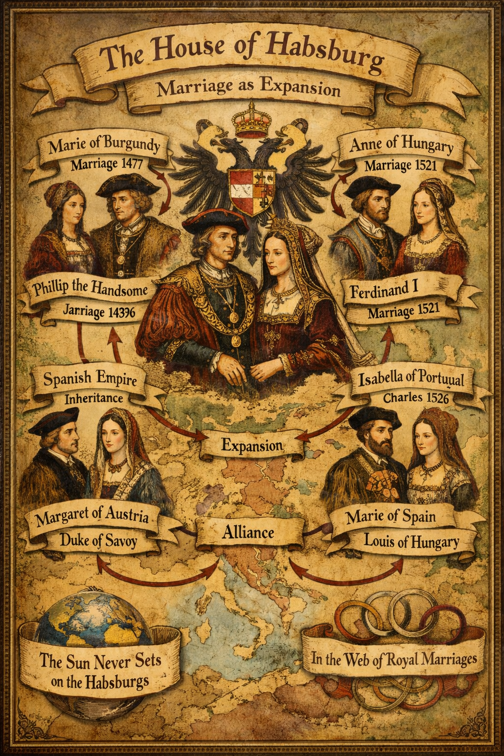 The House of Habsburg originated as a relatively modest noble family within the Holy Roman Empire, yet by the 13th century had secured control of Austria and begun to pursue far broader ambitions. Unlike rival dynasties that relied heavily on military conquest, the Habsburgs developed a more enduring approach to power, recognizing that warfare was costly, uncertain, and often temporary, whereas strategic marriages could yield lasting influence. In aristocratic Europe, marriage functioned as a mechanism of statecraft rather than romance, facilitating the transfer of territory, titles, and legitimacy between ruling houses. Through carefully orchestrated unions over successive generations, the Habsburgs consolidated control over vast regions, including Austria, Bohemia, Hungary, Spain, the Netherlands, significant parts of Italy, and extensive overseas colonies. By the 16th century, their dominion spanned much of Europe and the Americas, not solely through battlefield success, but through a disciplined and patient dynastic strategy—an enduring example of long-term, structure-driven power.